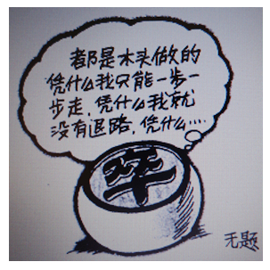 一幅漫画,它向我们展示了一个小“卒”的抱怨:“都是木头做的,凭什么我只能一步一步走,凭什么我就不能后退,凭……”可见,这是一个感情丰富且志向远大的“卒”。为什么呢?因为很少会有“卒”为自己的身世喋喋不休,它们懂得自己应坚守属于自己的同样重要的岗位上,不因自己只是一个‘卒’,于是就自暴自弃,于是就黯淡了自己也可以发出的光芒。而它呢?他却在抱怨不休。“守住自己的位置,坚守住自己心中的月亮吧!”我真想对这个多少有几分不安分的“卒”大叫一声。