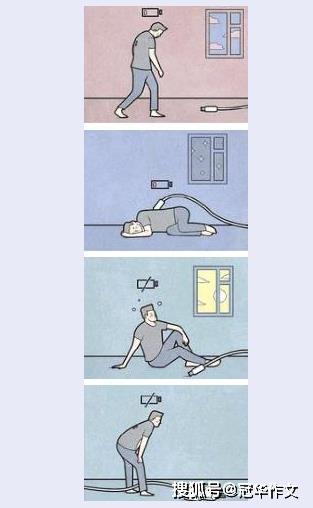 将“充电”对应人生状态,就可以将其理解为“充实生活”“明确目标”“努力的状态”等。反之,没有实现“充电”,就是没有前行的动力、适合的方向、充盈的精神等。总之,要准确揭示漫画所反映的现象并给出明确的看法,做出中肯的评价。